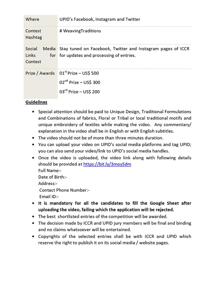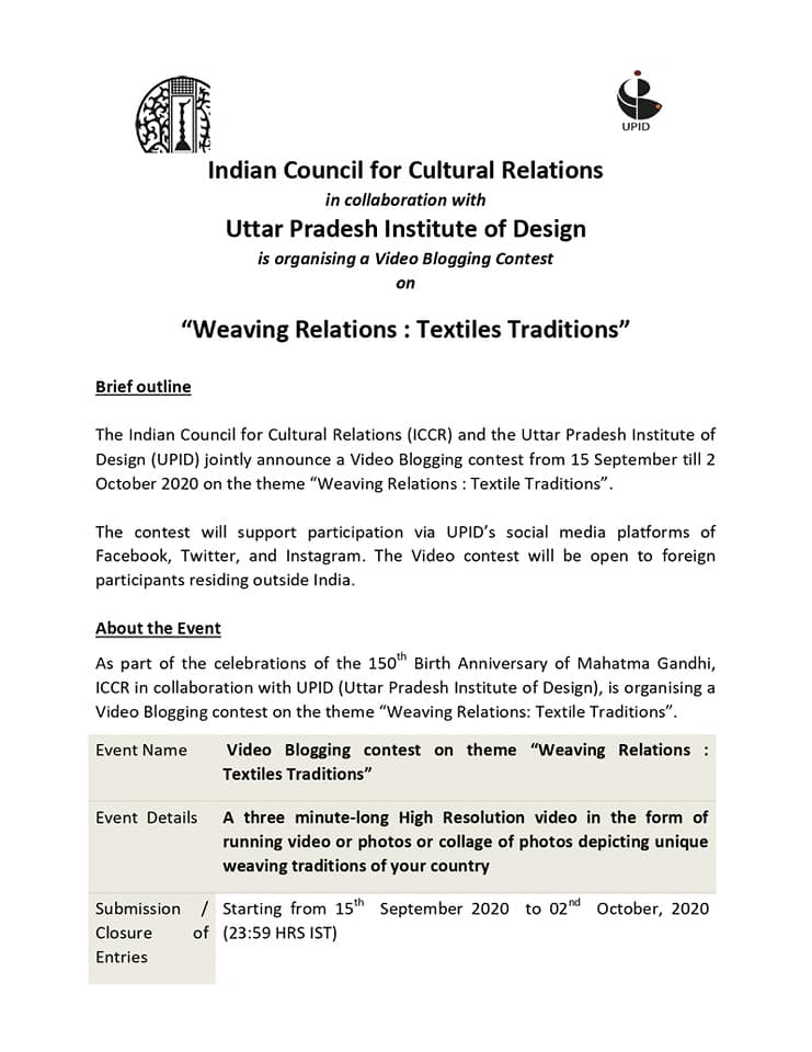 Video Blogging Contest by ICCR and the Uttar Pradesh Institute of Design (UPID) on "Weaving Traditions: Textile Relations"