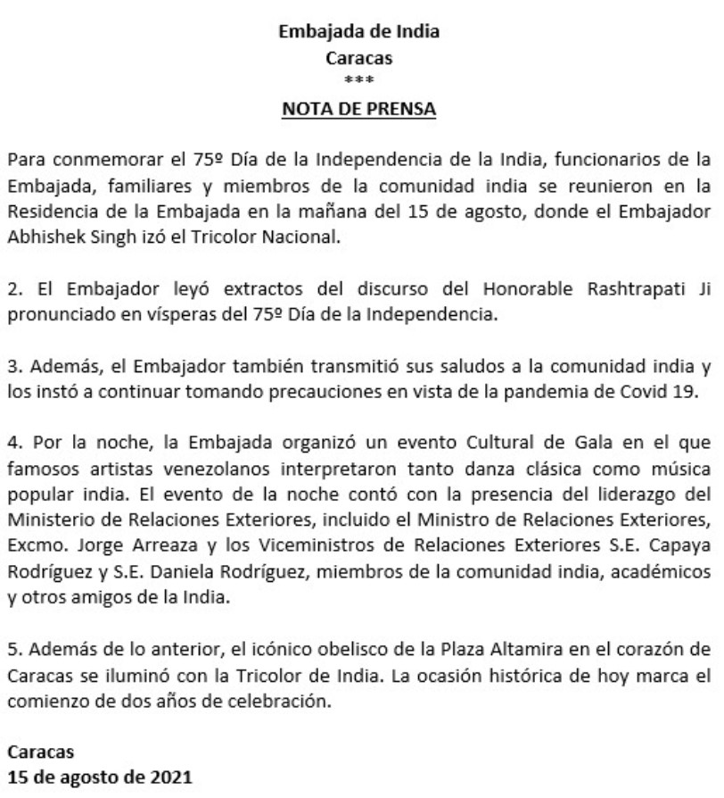 Nota de prensa acerca de las actividades realizadas por la Embajada de la India en Caracas por el 75 Dia de la Independencia en Caracas